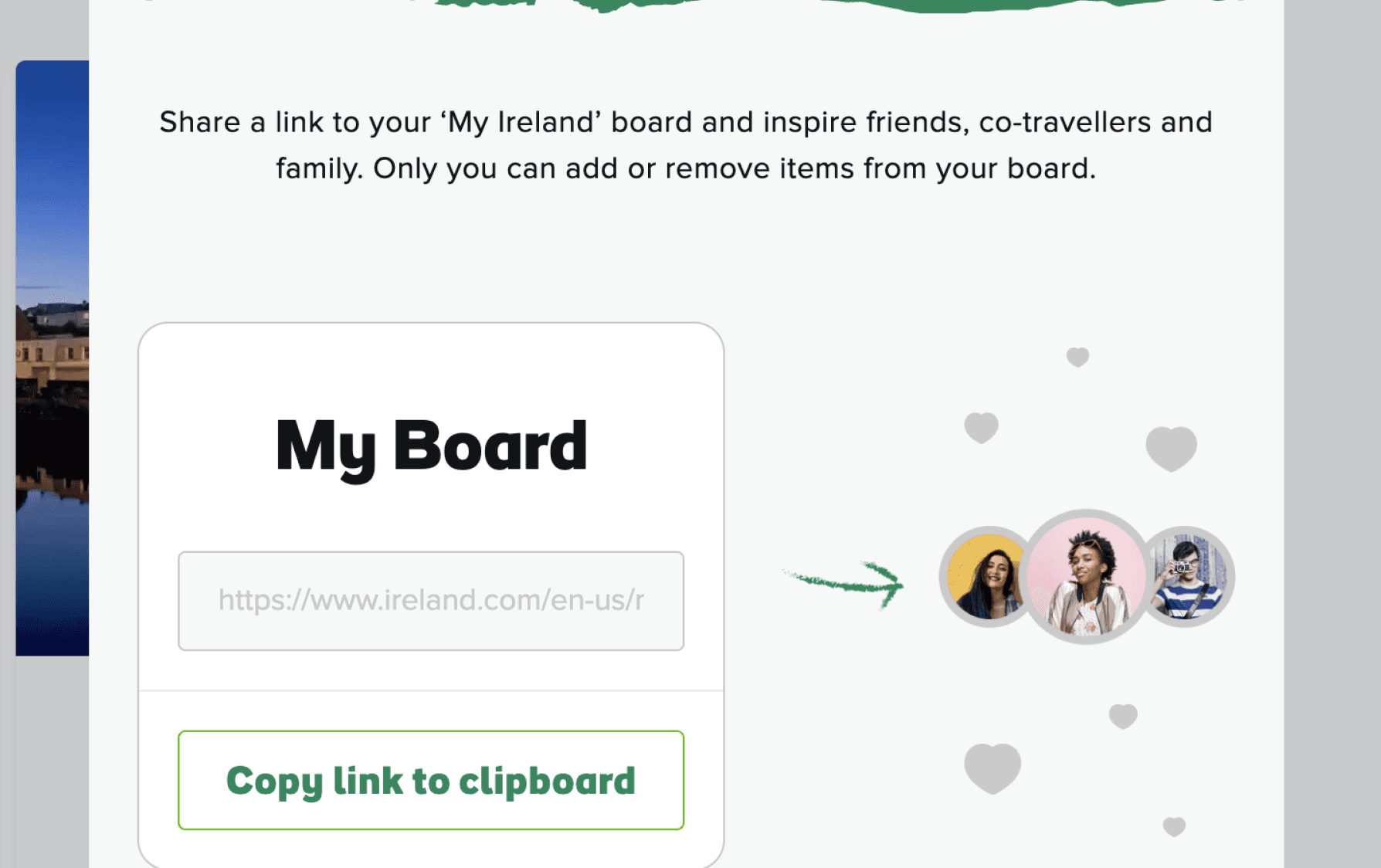 Making Planning More Collaborative: At the end of the planning journey, the user can easily share and collaborate with their co-travellers. Clear ownership language and concise instructions explain what sharing a board means—what others can see, and what only the owner can change. This clarity helps users confidently share travel plans, turning My Ireland from a solo tool into a shared experience.