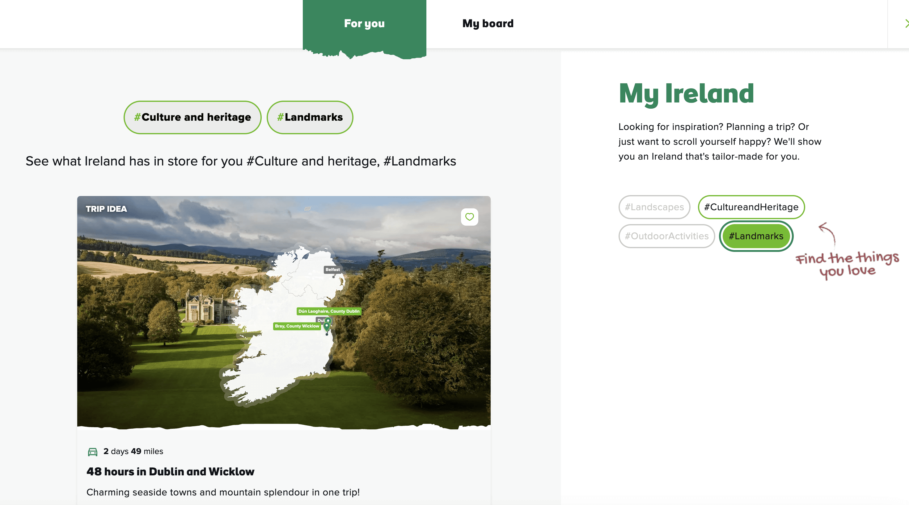 Personalizing Inspiration: My Ireland uses interest chips (#Landscapes, #CultureAndHeritage, etc.) to help users quickly find what resonates with them. I helped shape the naming, hierarchy, and sequencing of these chips so they felt intuitive even to first-time visitors.
