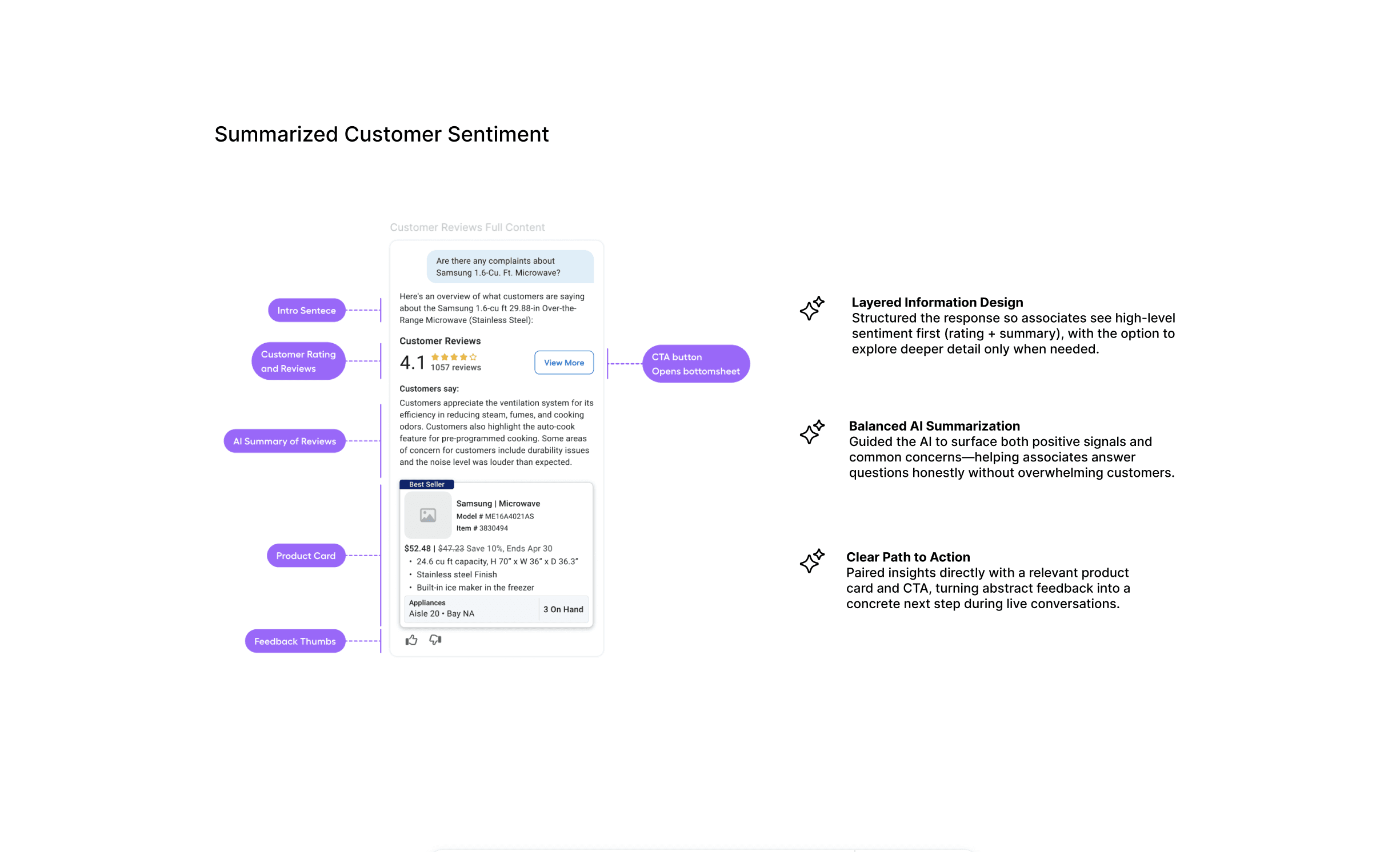 Store associates need to answer a wide range of customer questions in real time—from product location to comparisons to complex “how do I” scenarios. Early AI prototypes surfaced answers, but without clear structure or boundaries, responses risked being inconsistent, overly verbose, or unsafe for real-world retail use. The challenge wasn’t just what the AI said—it was how information was organized, prioritized, and constrained so associates could trust and act on it in live customer interactions.