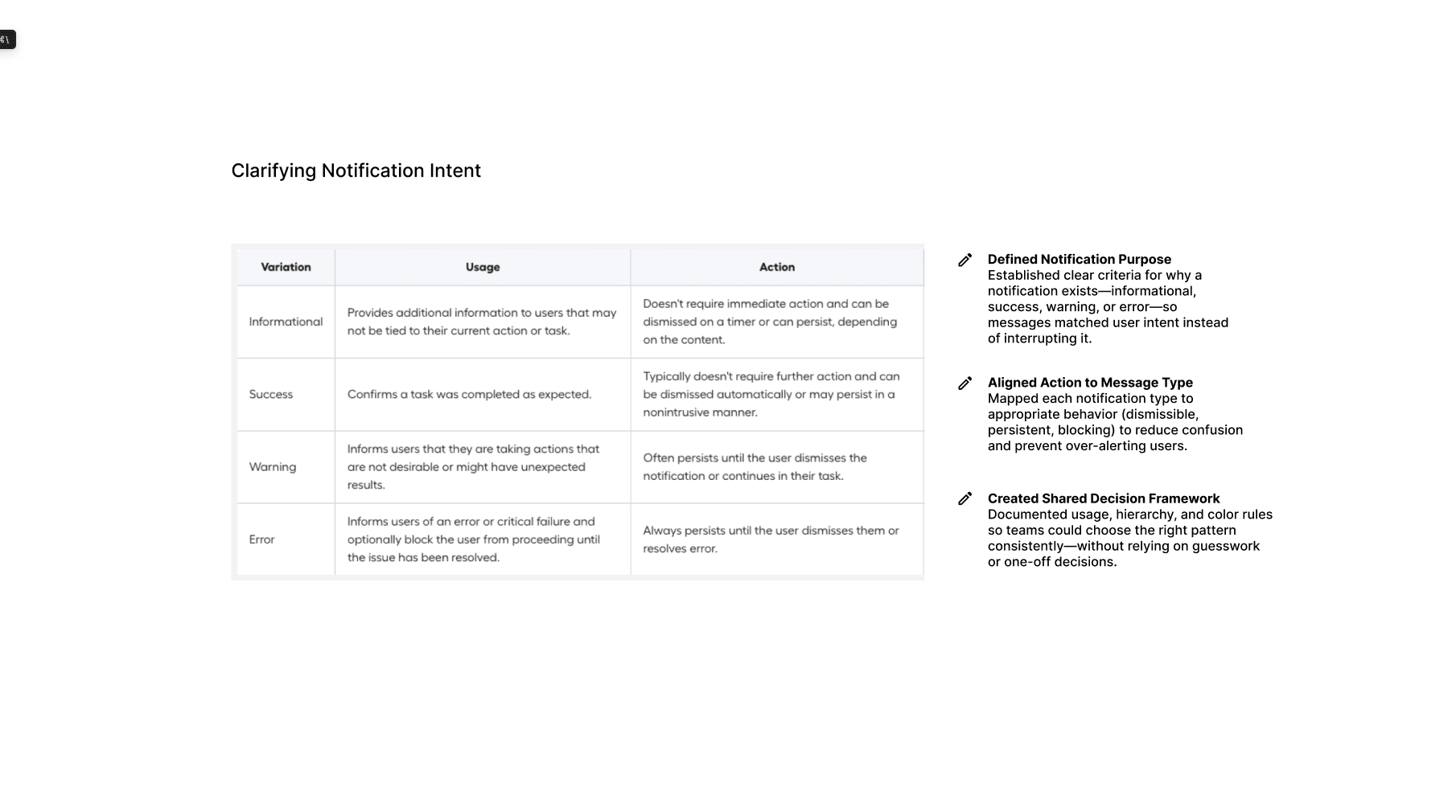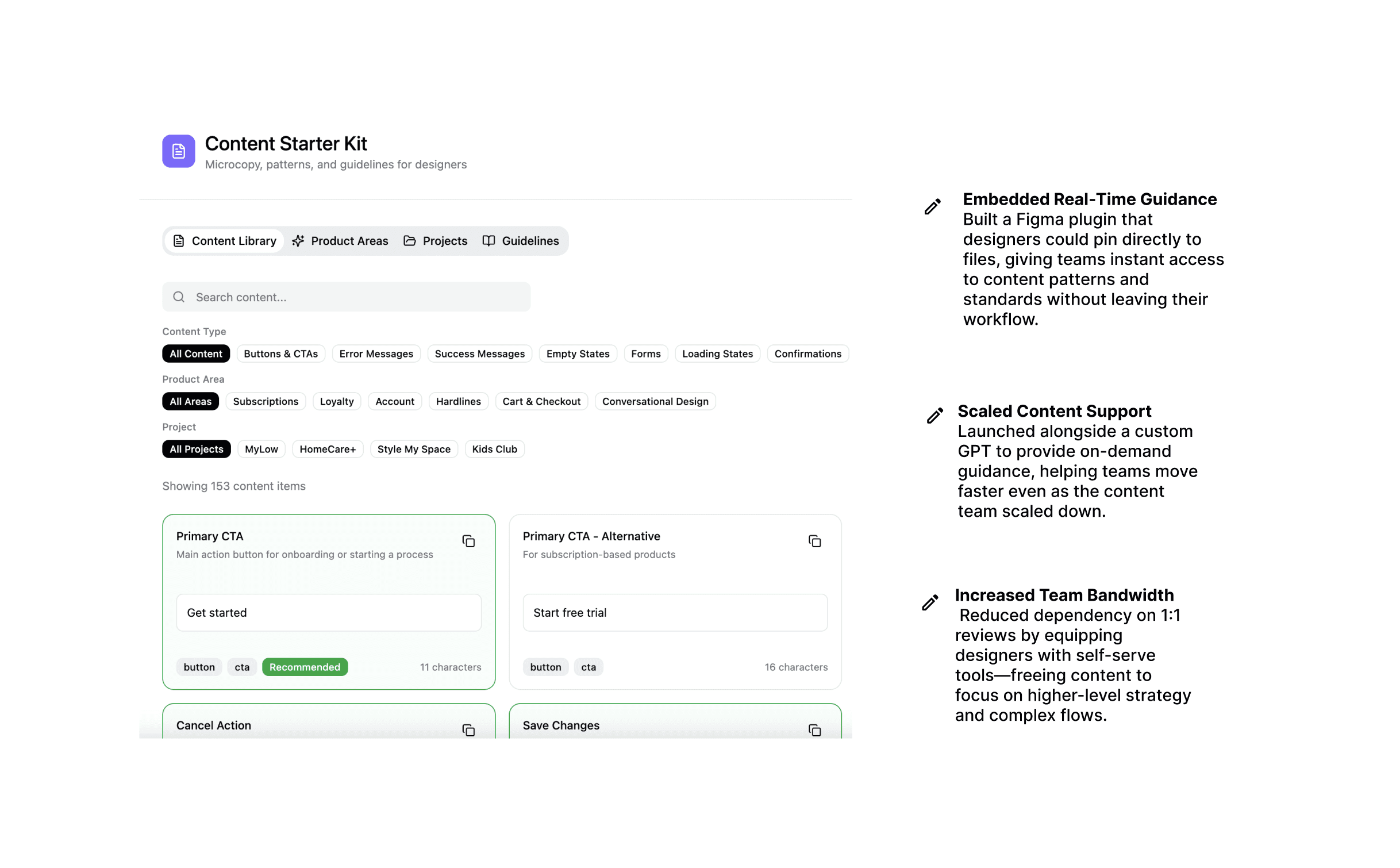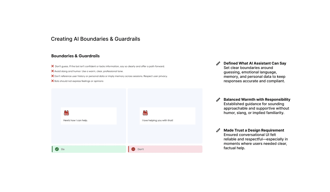 The playbook became a unified content system used across product teams. It aligned voice and tone, strengthened accessibility practices, standardized patterns, and empowered teams to make decisions on their own. To ensure the guidelines could scale, I integrated them into a ChatGPT-powered assistant—giving designers real-time guidance and freeing content designers to focus on strategic work.