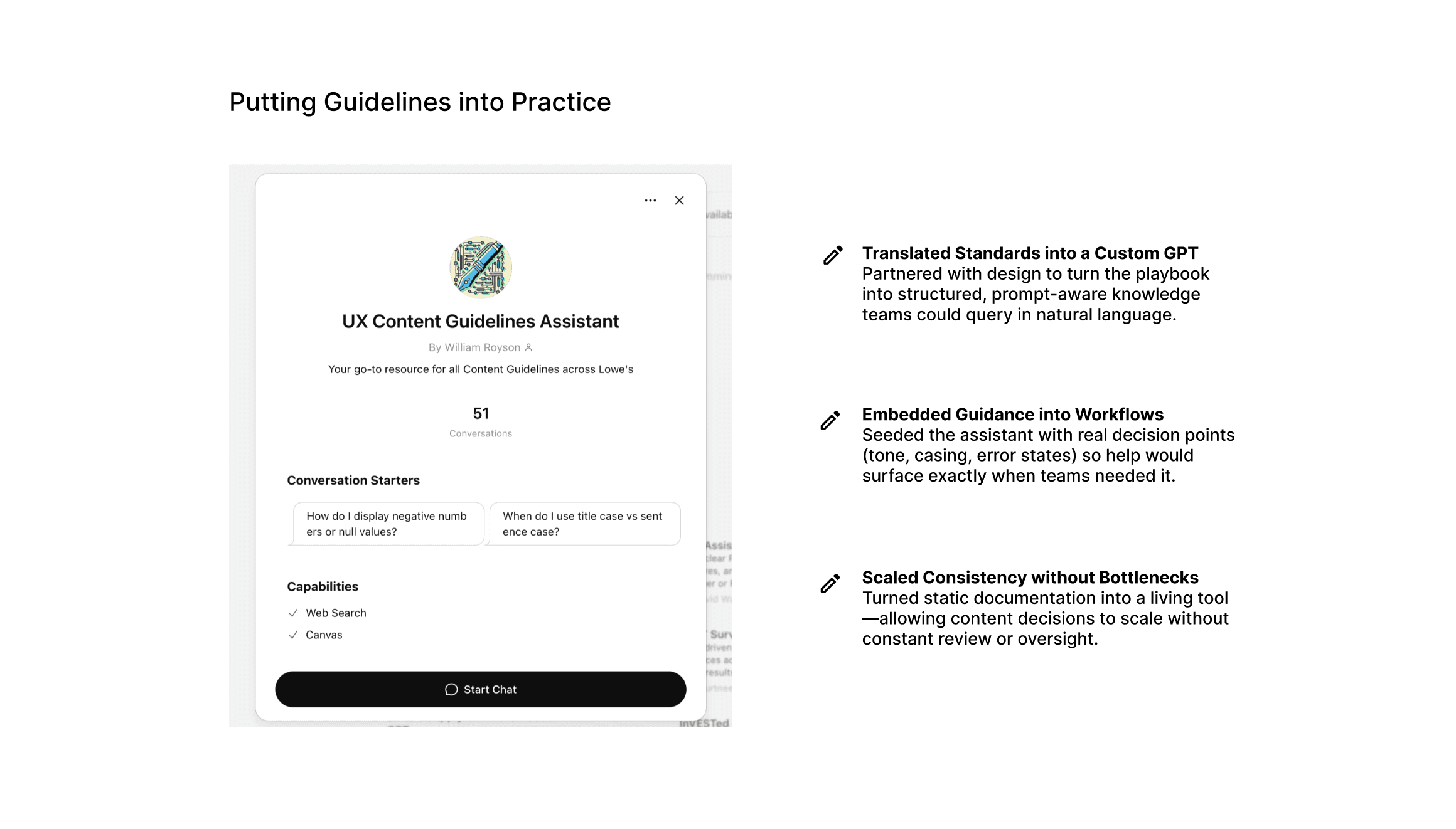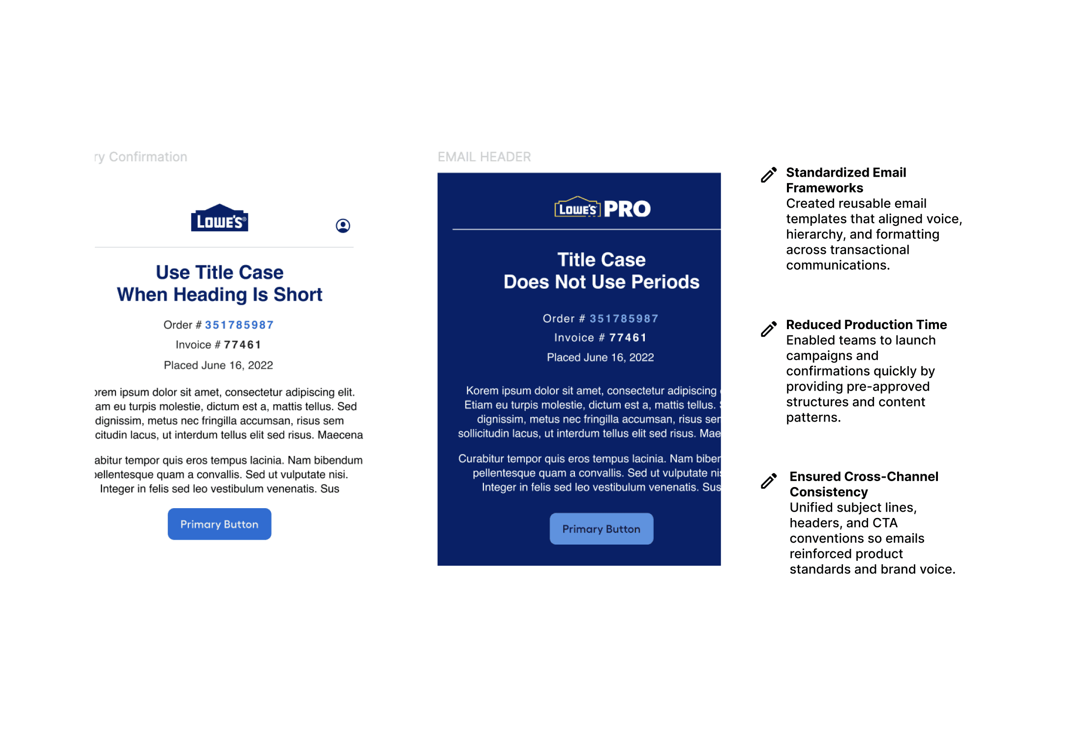 Lowe’s content across digital products had grown increasingly inconsistent in tone, structure, and accessibility. Teams were reinventing patterns, interpreting standards differently, or making content decisions in silos, leading to wasted time and uneven customer experiences.