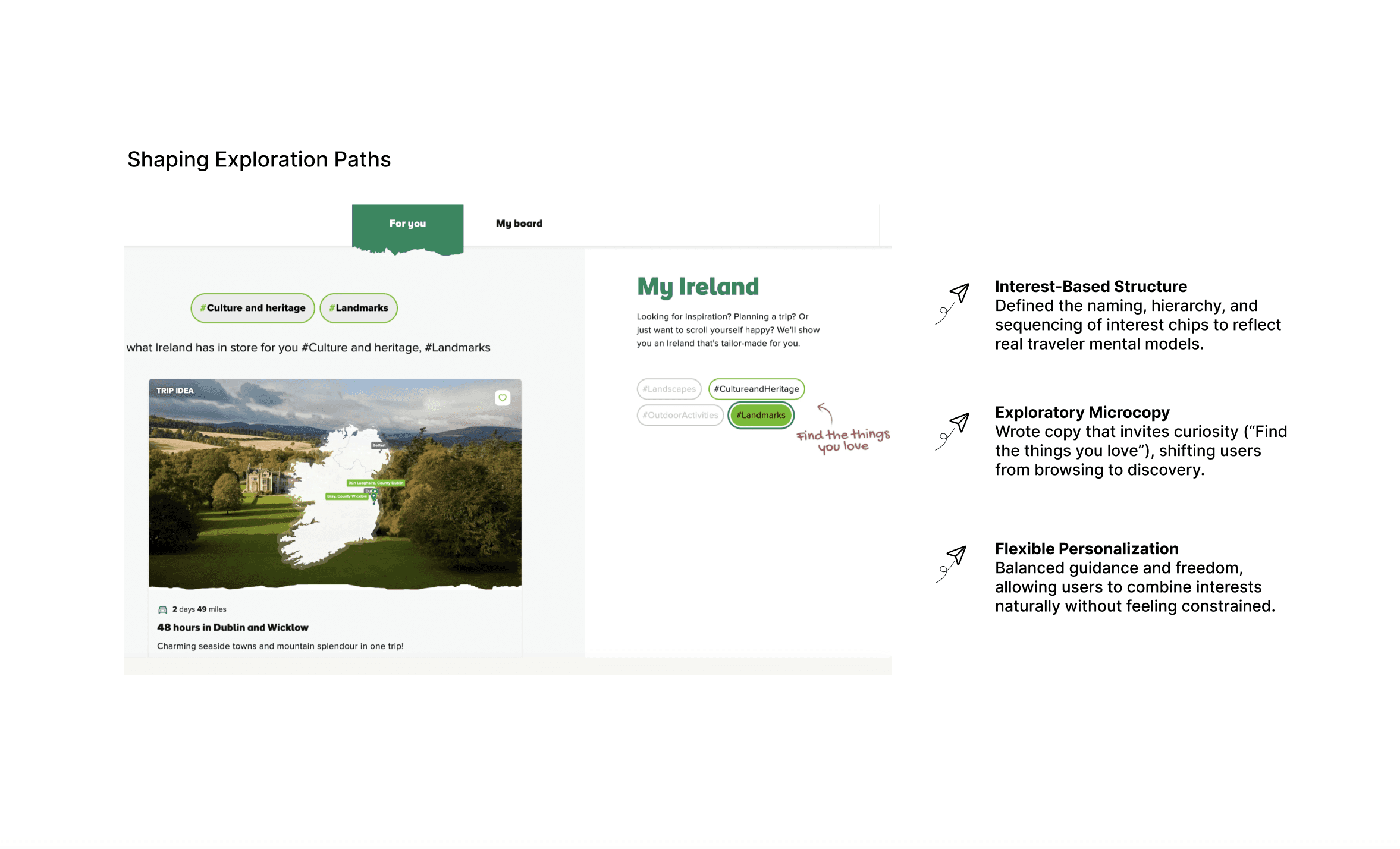 Ireland.com offered rich travel content, but it lived across separate pages without a cohesive way for users to save inspiration, personalize recommendations, or plan trips with confidence.